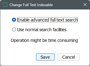 To remove the Full text Indexable = 'Yes' setting, select the field and choose Use normal search facilities and click the Save button. If this operation fails, choose it again, and click the Clean Up button.