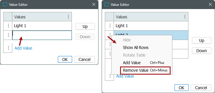 1. Click Add Value to add a new line, or click into the line to change the value. To delete a value, highlight it right-click on the arrow and click 'Remove Value.'