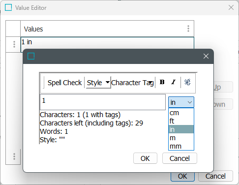1. Click OK when finished. If the node is a product containing sub products, the new values will be inherited to them. If it is a sub product, the values will be local and only apply to this product. If the attribute has units applied, the user can either key in the relevant units, or press <Alt> + <F2> to select a unit from the list. The example below is with a number validation base type with units applied.