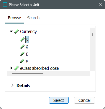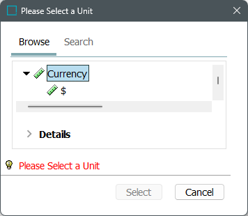 • For the Choose Base Unit parameter, click the selector button () to display a dialog. Use the Browse or Search tabs to find and select the relevant unit, and then click the Select button.