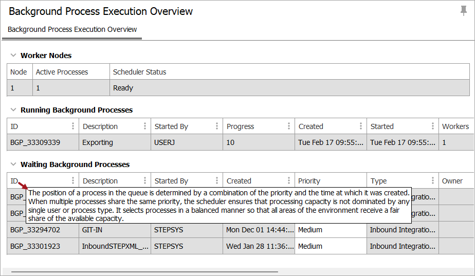 The 'Background Process Execution Overview' includes sections for Worker Nodes, Running Background Processes, and Waiting Background Processes.