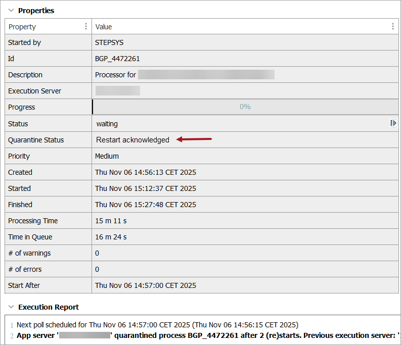 Sometimes, an application server / node crash is not caused by the specific background process that was quarantined. If the issue can be found and fixed, the quarantined background process can be restarted from the workbench. Alternatively, if you determine that the quarantined background process should not be started again, it can be deleted.