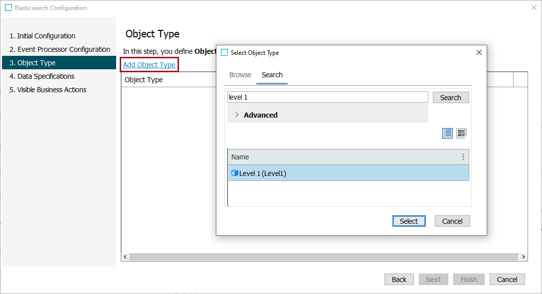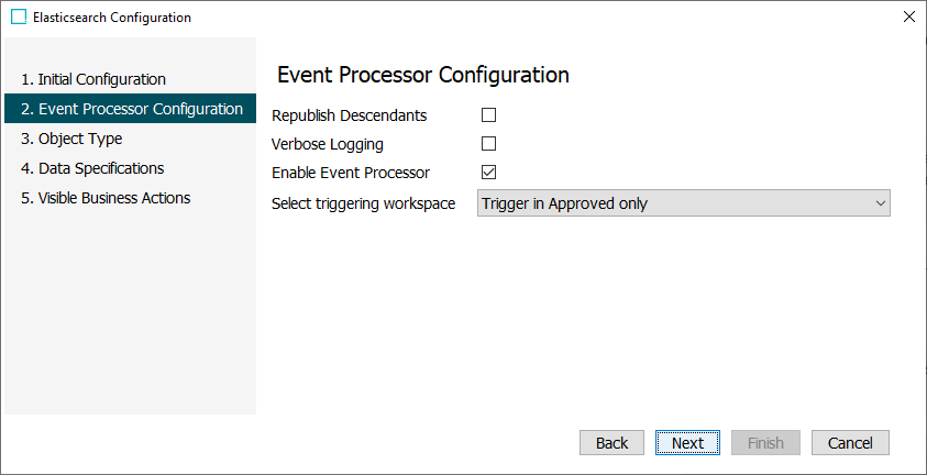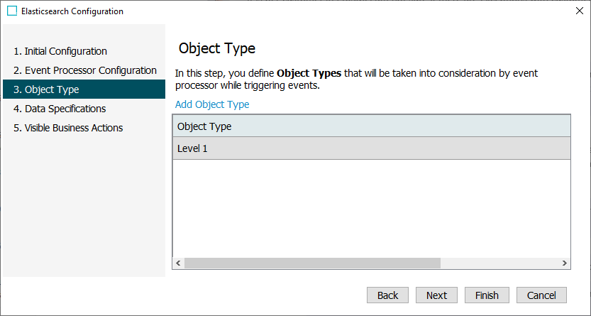 Note: Selected object types are added both to the Event Triggering Definitions of the event processor and to the Elasticsearch configuration.