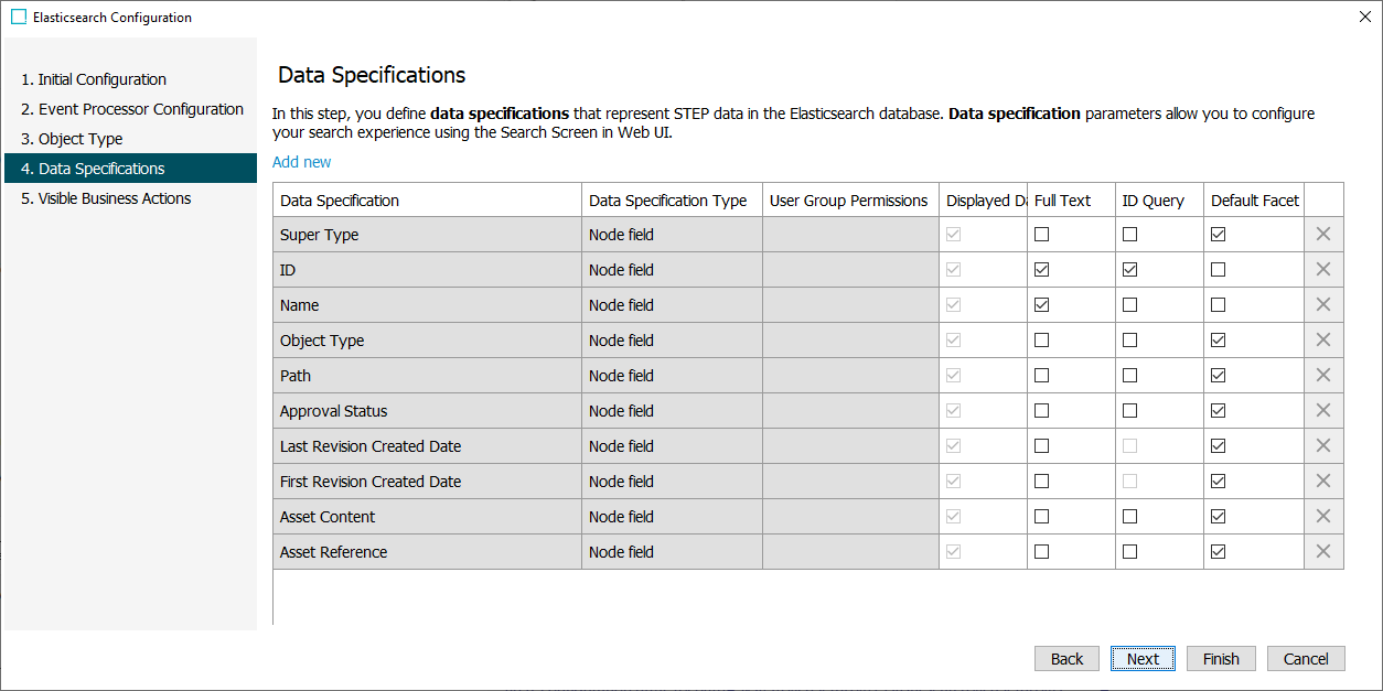 • Click the Add new link to modify the data specifications required for the Elasticsearch database and to set the data on the faceted Search Screen for full text searches, ID searches, and the default facets. Manually added items can also be manually deleted using the enabled delete button ().