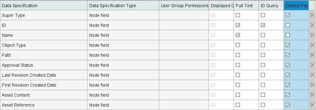 • Node fields are default items and cannot be deleted, as indicated by the gray background for the 'User Group Permissions' column and the disabled delete button (). User group permissions cannot be set for these default data specifications.
