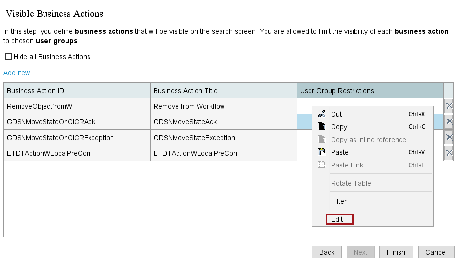 • To specify which user groups can view and execute specific business actions (and restrict access to those business actions for other user groups), right-click the cell within the 'User Group Restrictions' column that correlates with the business action you want to limit access to and click Edit.