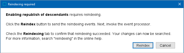 • Republish Descendants - Check the box to include children of the selected nodes when reindexing. Any changes made to attribute values will reflect on their descendant attribute values. Updated values are reflected in the search results so long as both parent and descendant object types are included in the Elasticsearch data specification configuration, detailed below in step 5 of the wizard.
