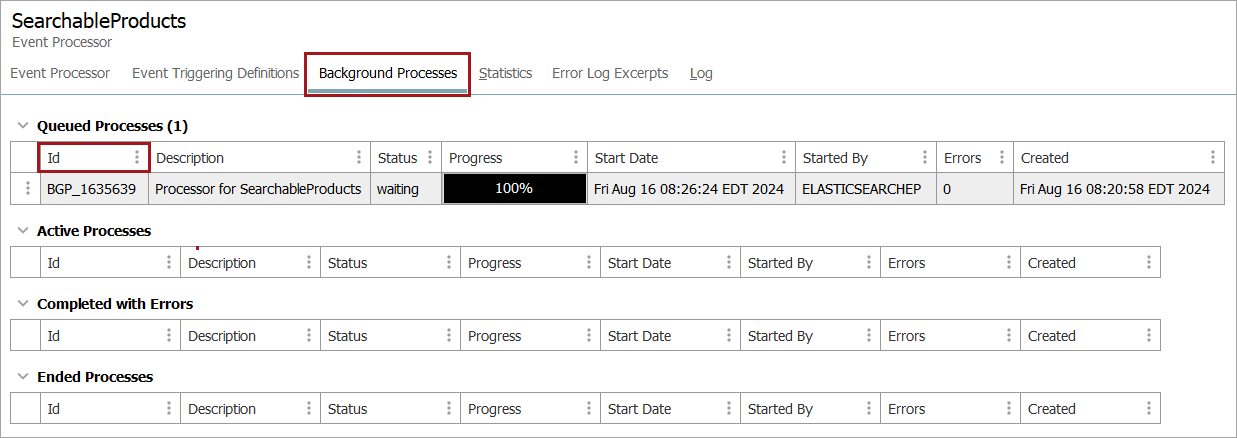 Navigate to the Background Processes tab for the event processor, in the 'Id' column, hover over and click the Id link of the event processor background process. This will navigate to the execution report for the Elasticsearch processor which will allow you to view all of the Elasticsearch indexing background processes.