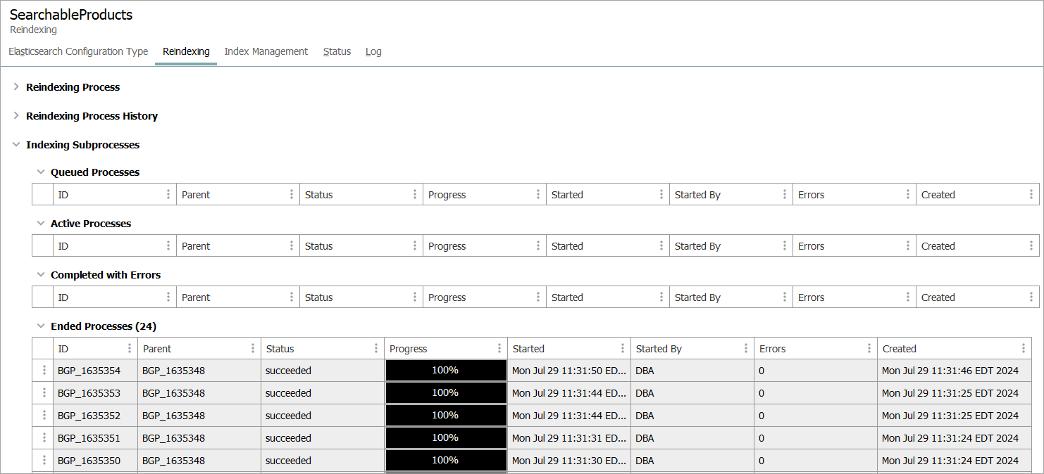 In the 'Indexing Subprocesses' section, the individual reindexing background subprocesses for the controlling reindexing background process are displayed. For details on the subprocess, hover over and select the ID link to display the Background Processes tab for the subprocess.