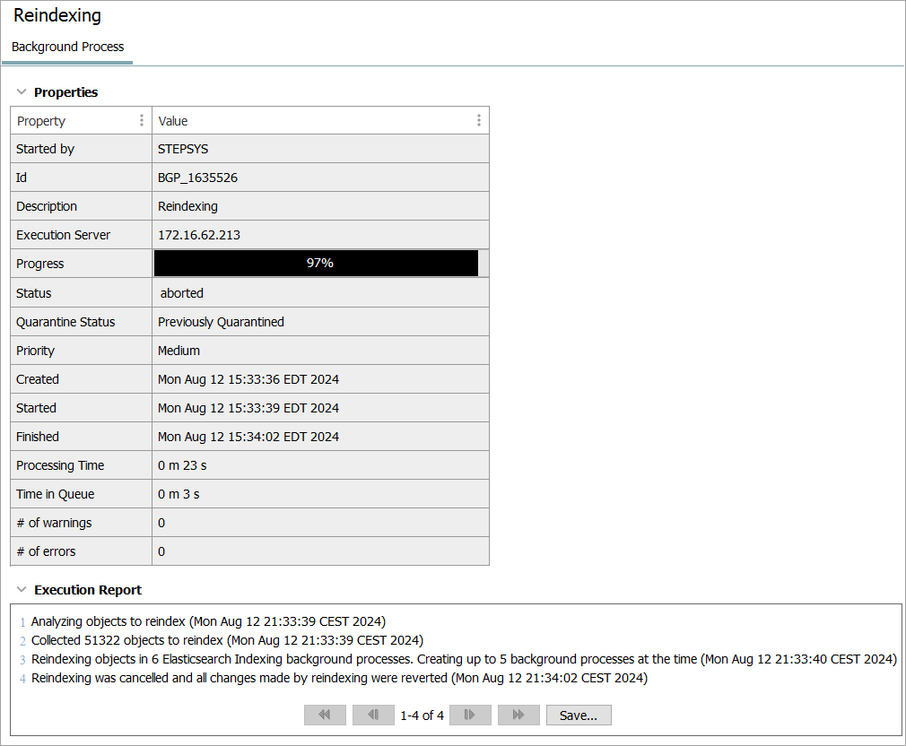 On the Background Process tab for the selected background process, review the Properties and the Execution Report. The progress of reindexing can be tracked with the progress bar located under the 'Progress' parameter. The execution report is a full summary of what occurred during reindexing.