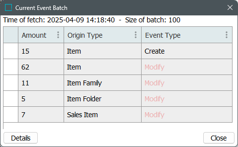 The Current Event Batch dialog displays the first 100 unread events on the queue. If the Event Mode parameter is set to Deduplicate, hover over the Event Type column text for the actual event types being deduplicated, as discussed in the EP - Event Processor Tab topic.
