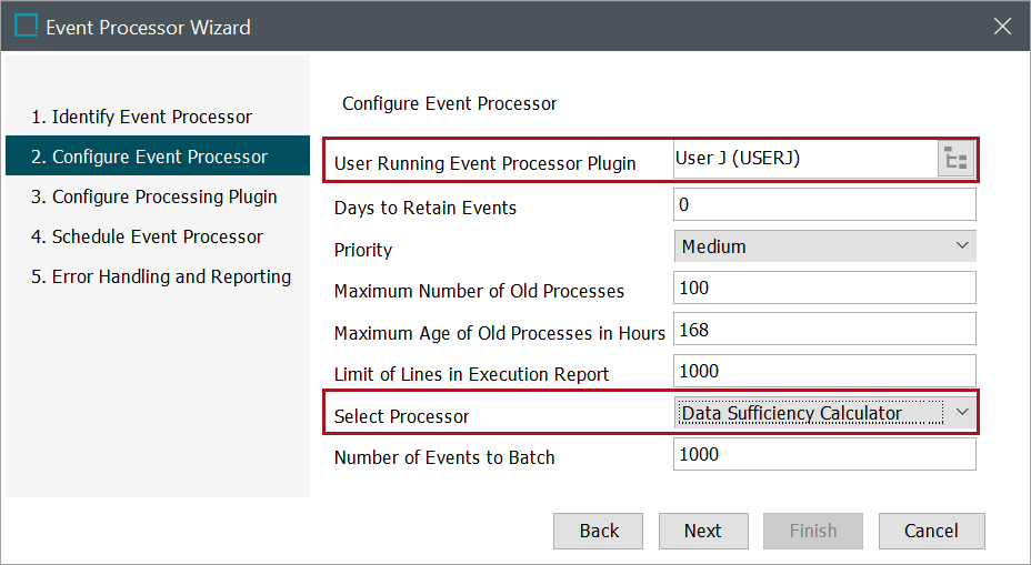 Each of the relevant parameters for the Event Processor Wizard 'Configure Processing Plugin' step are described below. Any additional wizard parameters with importance for this plugin are also included in this topic.
