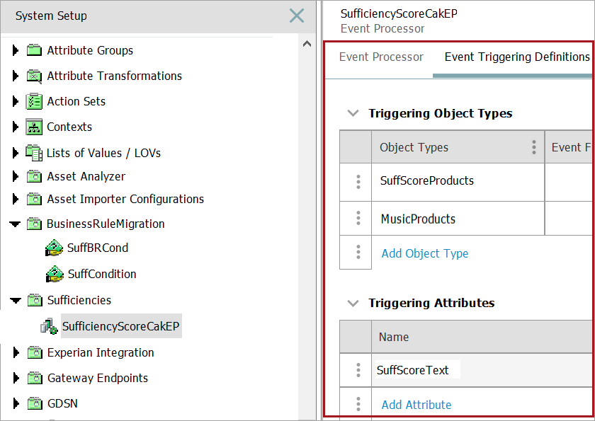The 'Triggering Object Types' parameter, located within the Event Triggering Definitions tab, must include the object types and the attributes included in the metrics that are part of the sufficiencies being run to evaluate data quality and completeness. In the example below, the object types 'SuffScoreProducts' and 'MusicProducts' will be evaluated for quality and completeness when the event processor is run. 'SuffScoreText' is the triggering attribute for the event processor.