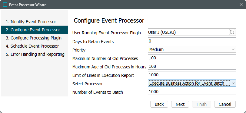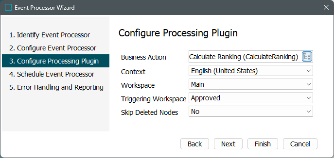 Once the Execute Business Action for Event Batch processing plugin has been selected, click the Next button, and the wizard step 'Configure Processing Plugin' will display.