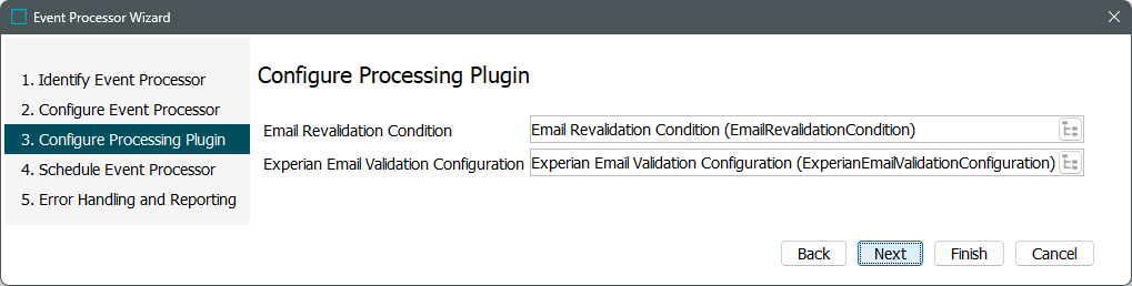Once the Experian Email Validation processing plugin has been selected, click the Next button, and the wizard step 'Configure Processing Plugin' displays.
