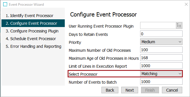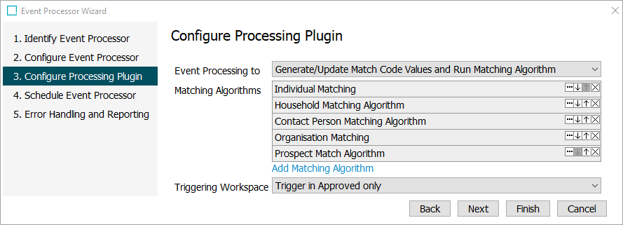 Once the Matching processing plugin has been selected, click the Next button, and the wizard step 'Configure Processing Plugin' displays.