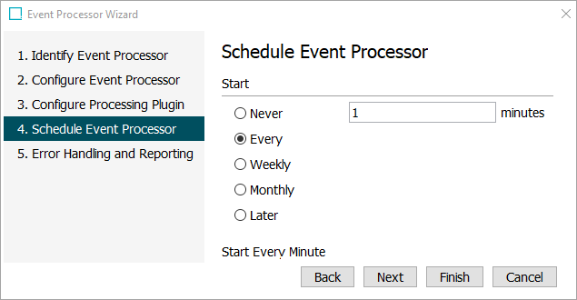 On the Schedule Event Processor step, select the desired schedule. The recommendation is every one (1) minute.
