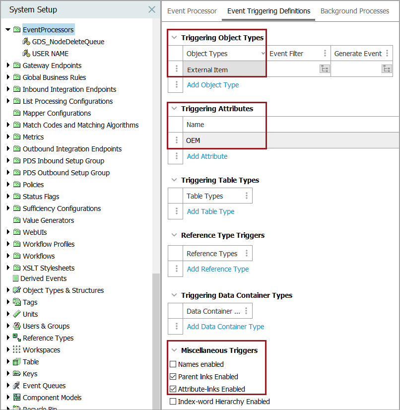 On the event processor's Event Triggering Definitions tab, use the Triggering Object Types, Triggering Attributes, and Miscellaneous Triggers sections to configure the event processor to listen for changes on anything that the match code or matching algorithm needs to perform.