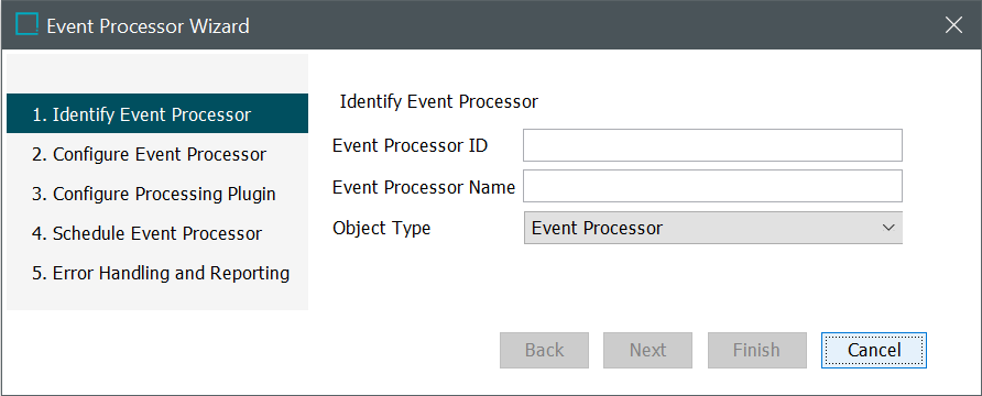 To complete the Event Processor Wizard Identify Event Processor steps: