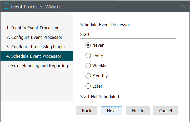 The wizard step 'Schedule Event Processor' will display with the following Start options.