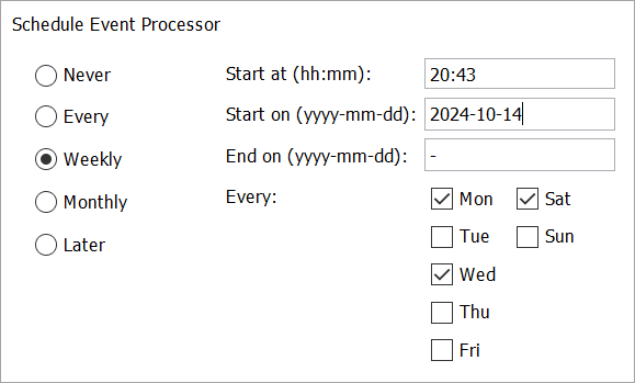 Later - automatically run the event processor only once, at the time and date specified. The selections are summarized at the bottom of the dialog.