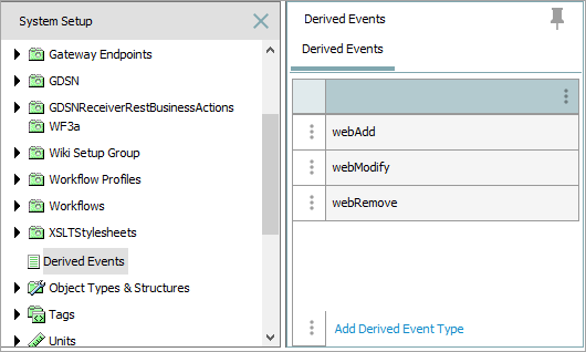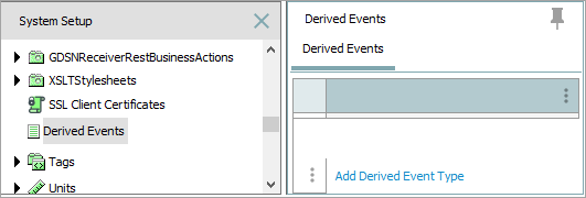 Type an ID and click the Add button to display the Derived Events tab with the newly added derived event type. In the example below, commonly used derived event types are listed. Once the derived event type is displayed, it is available for use.