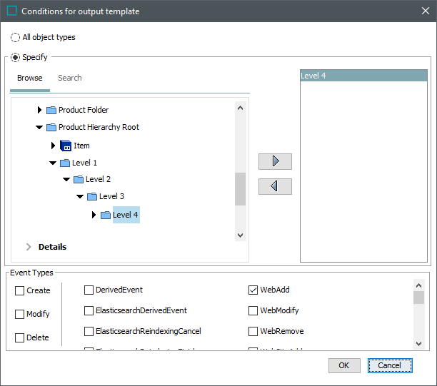 On the Conditions for Output Template dialog, select the object type and the derived event type. In this example the derived event type is 'WebAdd'.