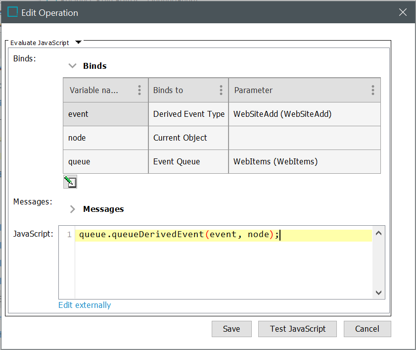 JavaScript business rules can access derived event types (such as the WebSiteAdd type shown below) via the Derived Event Type bind, as defined in the Event Handling Binds topic of the Resource Materials online help documentation. Derived events are generated for an object on event queues (also required to bind), event processors, or outbound integration endpoints (OIEPs) using the necessary binds and one line of JavaScript.
