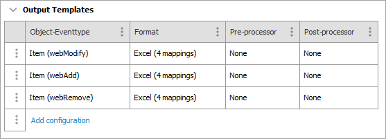 In an event-based OIEP, on the Configuration tab, open the Output Templates section and click the Add configuration link, or edit an output template that is already displayed.