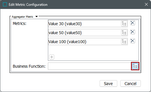 Although optional, the purpose of adding a business function to an aggregator metric is to return a score that is not the average score of the configured metrics. If no business function is selected, the returned score will be the average score of the configured metrics included in the aggregator metric.