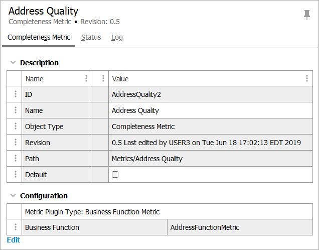 With the configured metric selected, the name of the metric plugin type (in this case, 'Business Function Metric') and the name of the selected business function will be listed in the Configuration section.