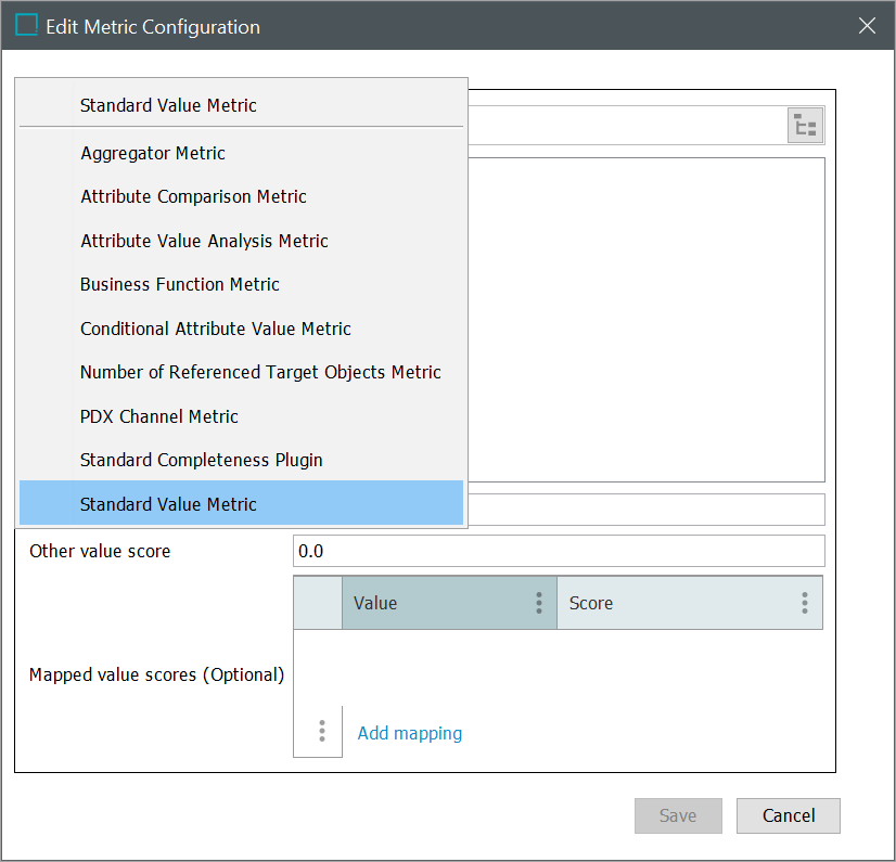 - In the Edit Metric Configuration editor, select the relevant metric type from the dropdown. Each metric type requires different configuration steps.