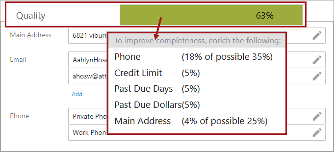 Metric score indicators are available on Node Details component pages, allowing users to view the quality of the data currently selected node in Web UI. Like in the workbench, object quality is represented by a completeness meter. Additionally, clicking on the meter will provide text describing what you can do to improve the quality percentage.
