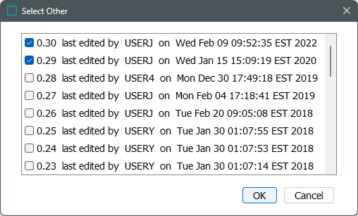 - To add or remove multiple revisions, click the 'Other' option to display a list of all revisions. Select all required revisions and click the OK button to display them in the comparison view.