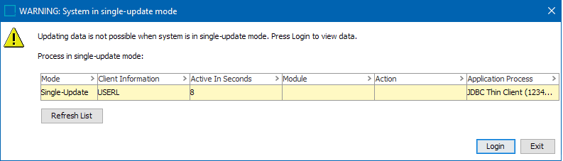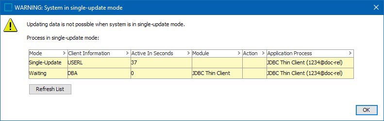 The warning displays information about which connection is currently running in SUM. While the user who is not in SUM cannot change data, they can still view data.