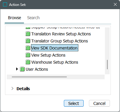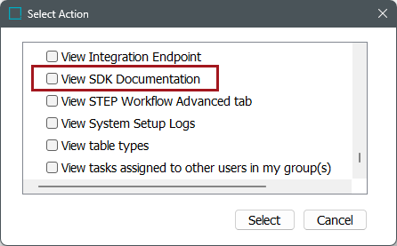 - In the Select Action dialog, scroll down and select View SDK Documentation, and then click Select.