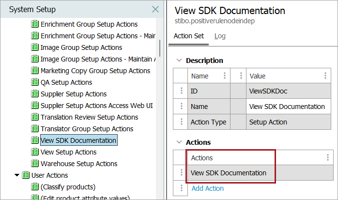 The action is now listed in the Actions area on the Action Set tab, and you can add the action set to the relevant user group.