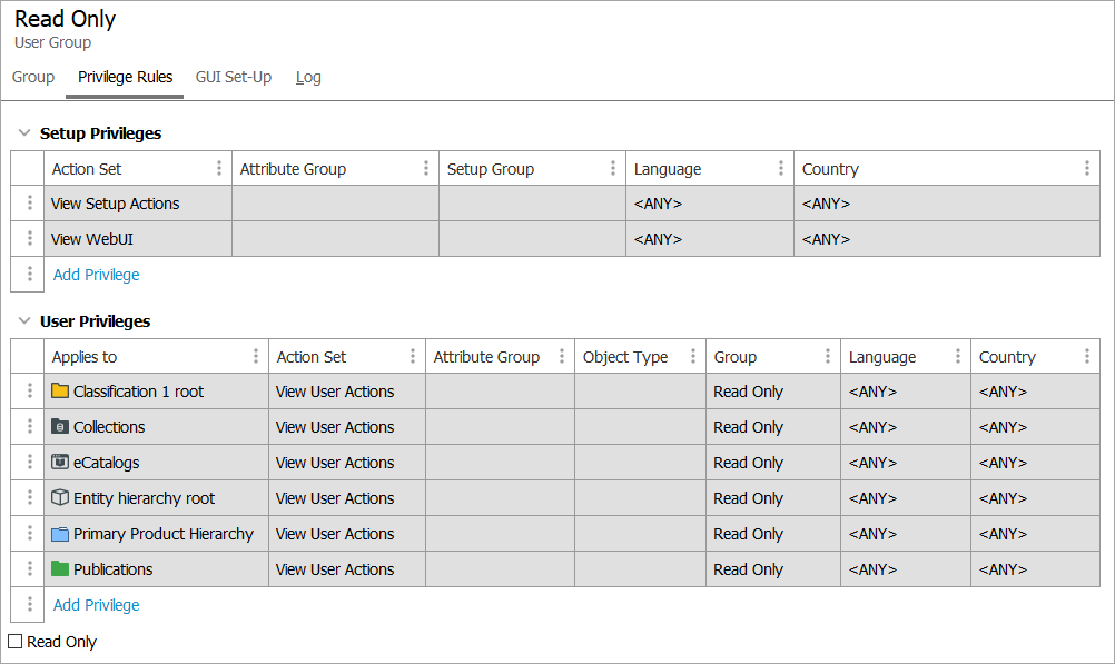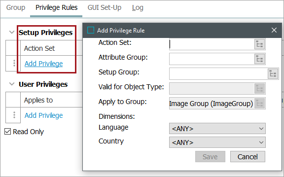 Each group must be assigned privilege rules, defining which actions the members of that group are allowed to perform, and which data the members of the group is allowed to work with. Defining the privilege rules forms one part of the privilege control system settings. The second part, defining action sets, is performed in System Setup under Action Sets. For more information, refer to Action Sets topic. A privilege rule grants all of the users in a group the permission to perform any of the actions in the selected action set. This permission can be restricted to specific sets of data. To prevent a group of users from making changes, refer to the Read-Only Access section below.