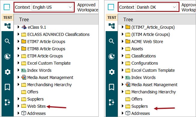 The example below shows an application where classifications have been made country-dependent, and an entire web structure has been created that is visible only in a context where English US is the selected country. The Web Sites folder is not visible in the Danish DK context.