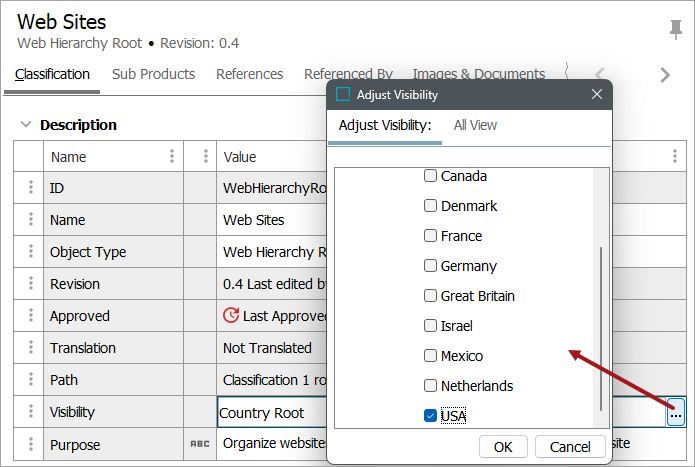 Click within the Visibility row, and then click the ellipsis button () that is available to the right of the words 'Country Root'. From the 'Adjust Visibility' dialog, select which country or countries your folder structure will show in. In this example, we have a classification structure for Web Sites US.