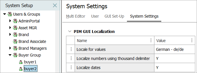 In this example 'buyer2' is logged on the workbench. The user is set up to use a German - DE locale for numbers and dates. A comma displays in single and multi valued attributes and LOVs. 'buyer2' can only use a comma as a decimal separator for numbers. When 'buyer2' saves a number into the database, the English - en/en locale will be used to save the number. So if 'buyer2' enters a number: 123,45 into a value field, the value is saved in the database as 123.45.