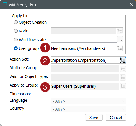 • User action Impersonate User enables any user with this privilege assigned to be able to impersonate the selected user group identified in the privilege setup.