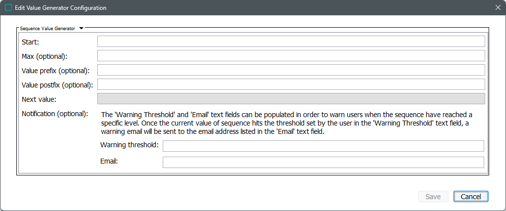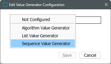 - Once the desired parameters are populated, click 'Save' and close the Edit Value Generator Configuration dialog.
