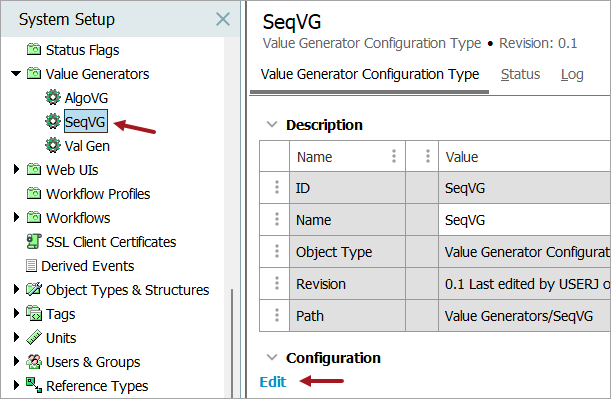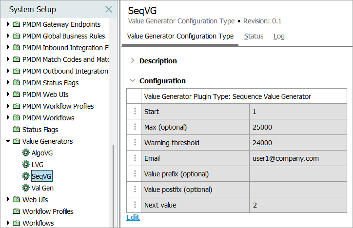 - With the desired Value Generator Configuration Type selected, click the 'Edit' link, which is located under the Configuration section of the Value Generator Configuration Type editor.