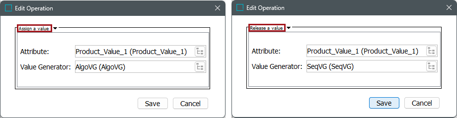 - Within the business action Edit Operation dialog, select 'Value Generator' > 'Assign a value' or 'Release a value,' depending on the action to perform.