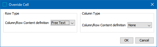 - In the Override Cell dialog, you can choose to override the content definition of the row, column, or both.