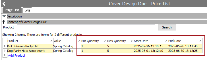 For each product in a table, Date Spread Commercial data pulls all values (typically prices) from the commercial list and sorts them by time periods. For each time period, a row is created dynamically.