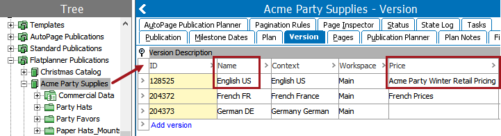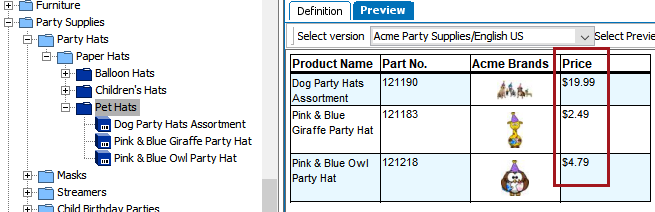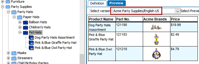 The pricing is viewed in the resolved table by selecting the Acme Party Supplies/English US version from the 'Select version' dropdown list on the tables Preview tab.