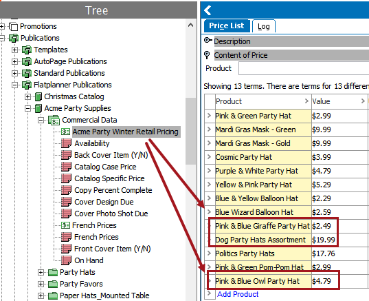 The three products mounted in the table pull their values from the 'Acme Party Winter Retail Pricing' list.