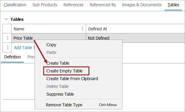 Instead of using the Create Table wizard, an alternate method of creating a new table is to create an empty table. This method allows you to create a table without necessarily having to know beforehand what attributes and/or products will be used, other than the product on which the table will be built. As with tables that are built with the Create Table wizard, an empty table will also need additional configurations once created, such as the addition of plain text or images, dynamic content definitions, and transformations. For information on how to add these more advanced features, refer to the Content Definitions topic.